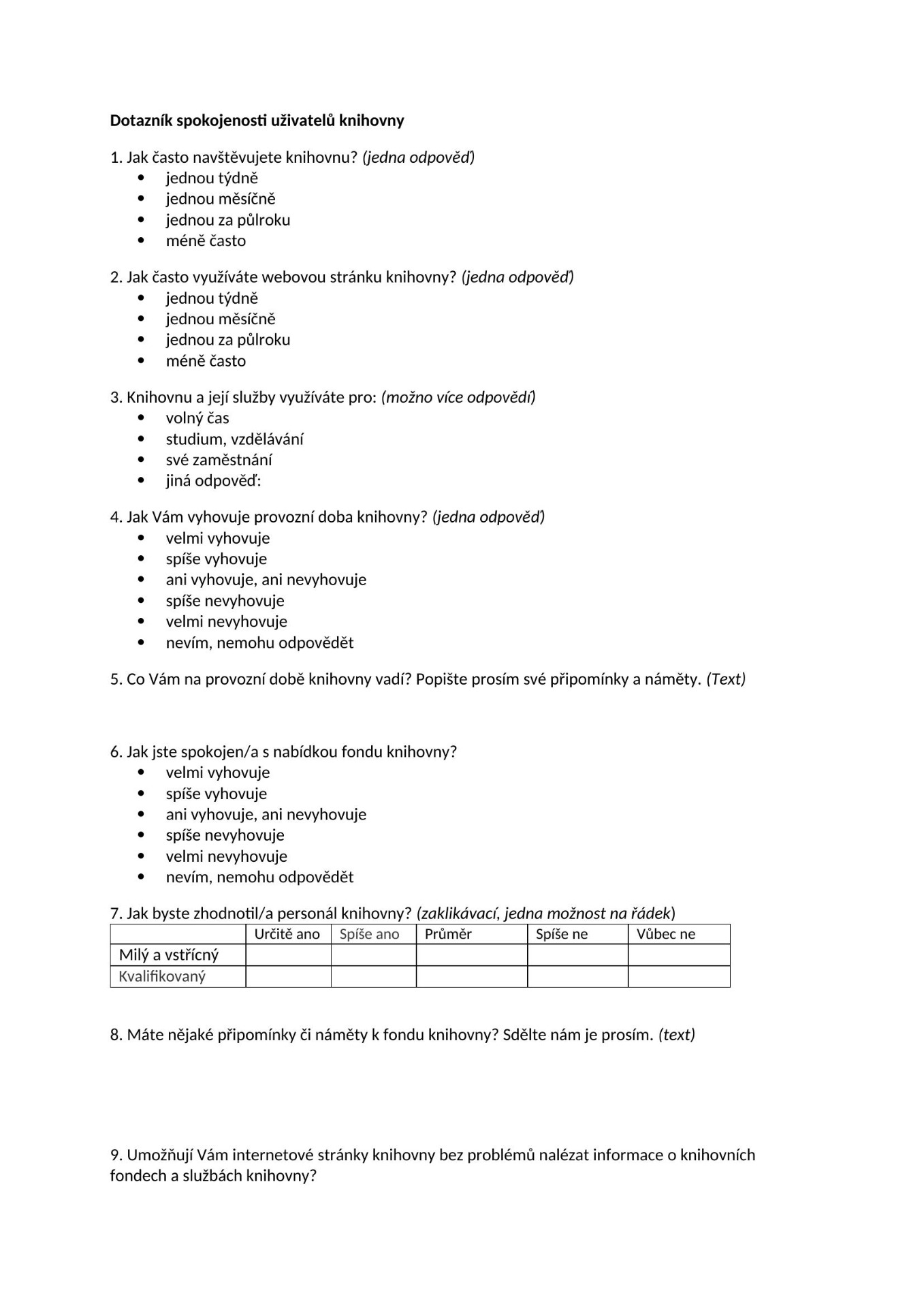 Vaše názory jsou pro nás důležité. Prosíme, věnujte pár minut vyplnění našeho dotazníku a pomozte nám vytvořit ještě lepší služby pro vás! Dotazník si vytiskněte a vyplněný přineste k nám do knihovny.